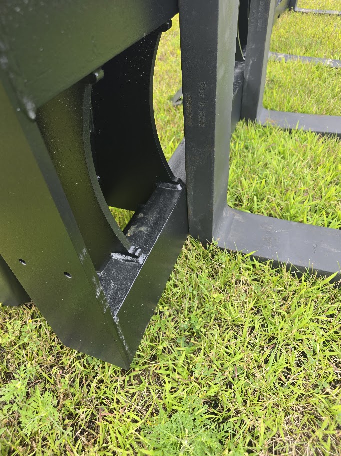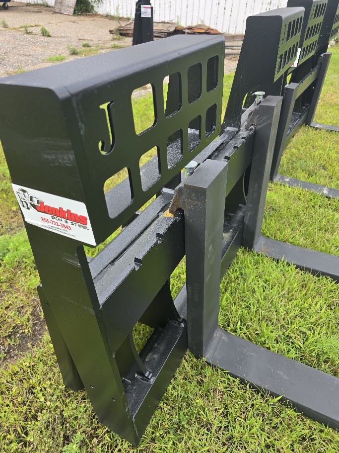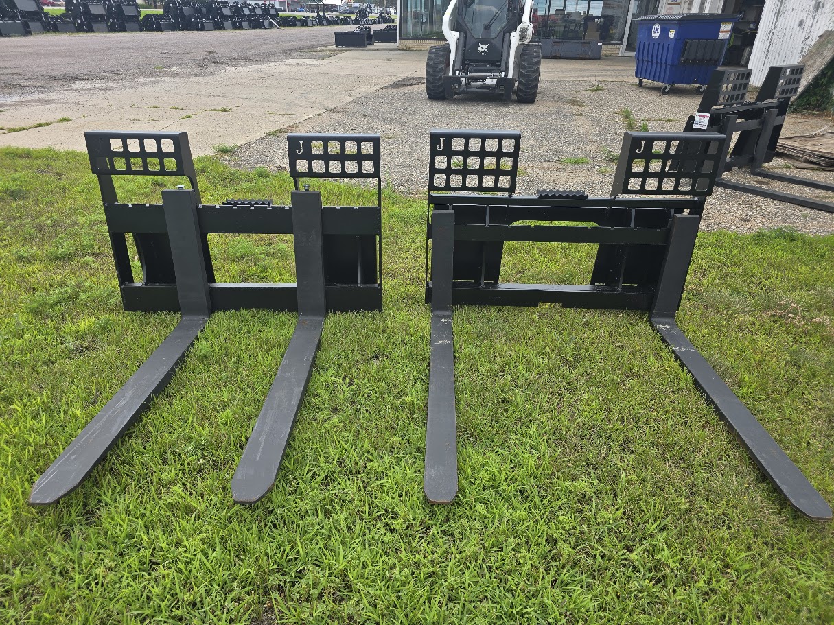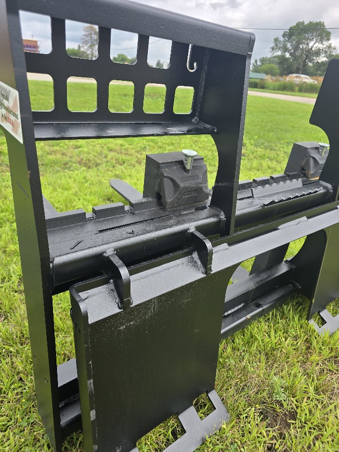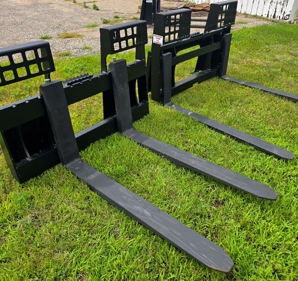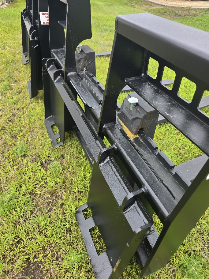 These Super Duty Pallet Forks are rated 10,000lb. Class 3 forks on a whole new carriage (not compatible with the regular carriage mounts), beefed up in every aspect. Great for 100-150hp skidsteers or payloaders.